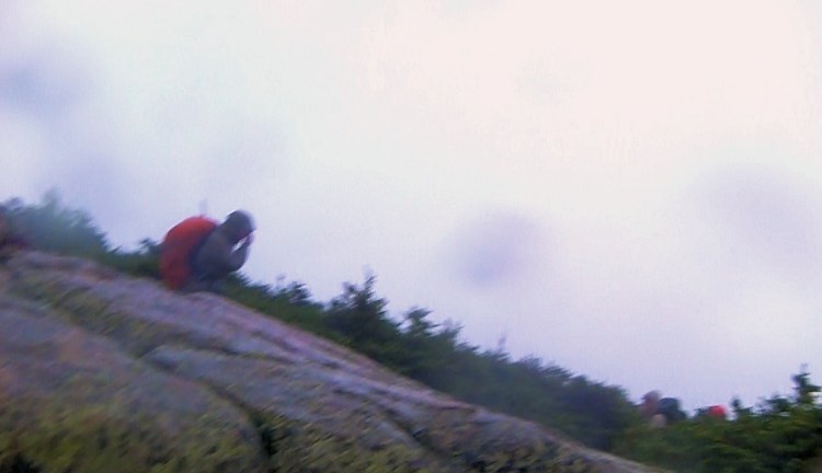 On South Twin the wind sucker punches me knocking me flat on my back and down for the count.  I score a 10 on my impression of a turtle struggling to flip itself over as I struggle to turn over on my hands and knees to stand up.  Eventually I get on all fours, then on my feet, (though it be at a 45-degree angle). It rips the pack cover right off the guy in front of me! (It probably landed back at the southern terminus… do not pass go and do not collect $200. =) Once up, I struggle back into the tree line looking like I’m dragging a stalled cog-train behind me.