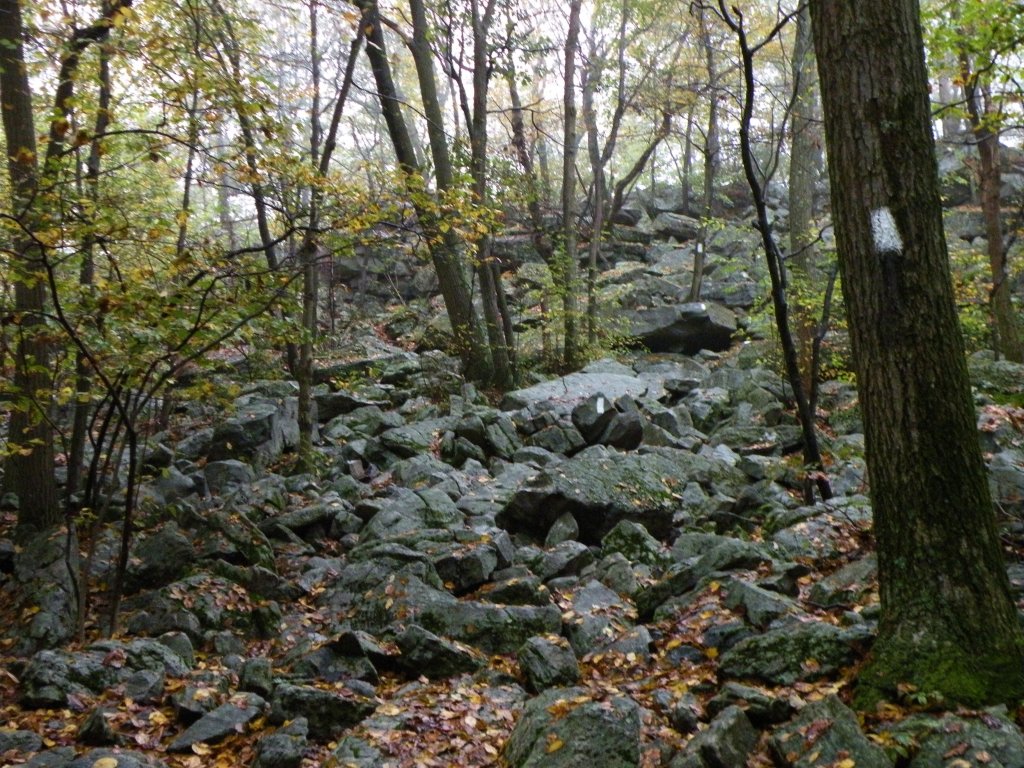 When I was hiking across the area in the picture, the Wolf Rocks, it was raining. There were wet leaves everywhere, and of course in some areas there was lichen on the rocks. ☹